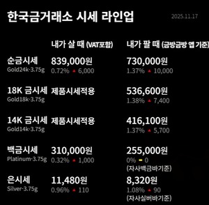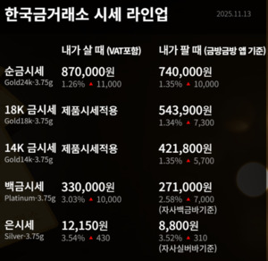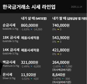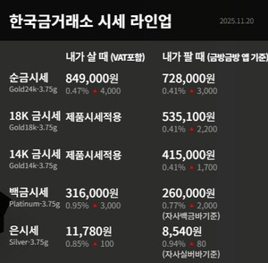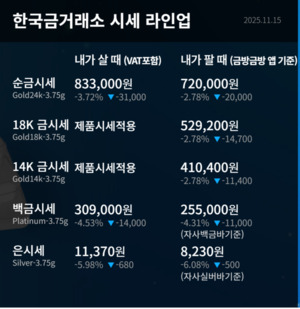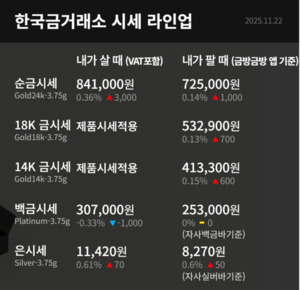 [더페어] 정도영 기자 = 금값시세는 22일 토요일 한국금거래소 기준 순금 3.75g(한돈)이 살 때는 84만1000원, 팔 때는 72만5000원으로 거래되고 있다. 금시세는 거래 시각에 따라 달라질 수 있다.18K 금시세는 팔 때 53만2900원, 14K 금값시세는 팔 때 41만3300원이다.백금은 팔 때 25만3000원으로, 은 시세는 팔 때 8270원을 기록하고 있다.한국금거래소에 따르면 이날 오전 10시31분 기준 국제 금시세는 순금이 매수시 트로이온스당 4064.87달러, 매도시 4067.87달러다. 국제 백금시세는 매수시