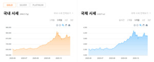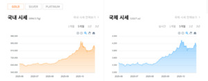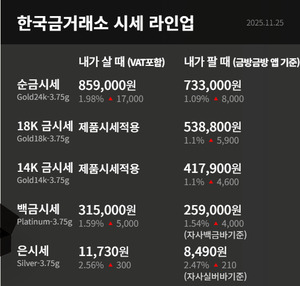 [더페어] 백상일 기자 = 금값시세는 25일 화요일 한국금거래소 기준 순금 3.75g(한돈)이 살 때는 85만9000원, 팔 때는 73만3000원으로 거래되고 있다. 금시세는 거래 시각에 따라 달라질 수 있다.18K 금시세는 팔 때 53만8800원, 14K 금값시세는 팔 때 41만7900원이다.백금은 팔 때 25만9000원으로, 은 시세는 팔 때 8490원을 기록하고 있다.한국금거래소에 따르면 이날 오전 10시 29분 기준 국제 금시세는 순금이 매수시 트로이온스당 4126.76달러, 매도시 4128.99달러다. 국제 백금시세는 매수