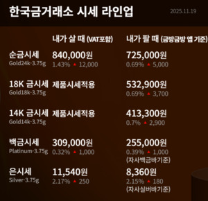 [더페어] 정도영 기자 = 금값시세는 19일 수요일 한국금거래소 기준 순금 3.75g(한돈)이 살 때는 84만원, 팔 때는 72만5000원으로 거래되고 있다. 금시세는 거래 시각에 따라 달라질 수 있다.18K 금시세는 팔 때 53만2900원, 14K 금값시세는 팔 때 41만3300원이다.백금은 팔 때 25만5000원으로, 은 시세는 팔 때 8360원을 기록하고 있다.한국금거래소에 따르면 이날 오전 11시28분 기준 국제 금시세는 순금이 매수시 트로이온스당 4062.16달러, 매도시 4064.36달러다. 국제 백금시세는 매수시 트로이