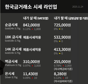 [더페어] 백상일 기자 = 금값시세는 24일 월요일 한국금거래소 기준 순금 3.75g(한돈)이 살 때는 84만2000원, 팔 때는 72만5000원으로 거래되고 있다. 금시세는 거래 시각에 따라 달라질 수 있다.18K 금시세는 팔 때 53만2900원, 14K 금값시세는 팔 때 41만3300원이다.백금은 팔 때 25만5000원으로, 은 시세는 팔 때 8280원을 기록하고 있다.한국금거래소에 따르면 이날 오전 9시 44분 기준 국제 금시세는 순금이 매수시 트로이온스당 4064.44달러, 매도시 4066.64달러다. 국제 백금시세는 매수시