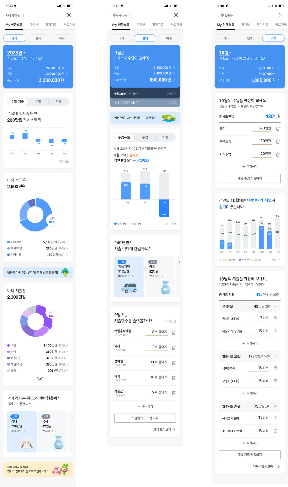 ‘My 현금흐름’ 서비스는 ‘과거’, ‘현재’, ‘미래’ 3가지 테마로 구성되어 있다. 사용자는 각각의 서비스 테마를 통해 과거부터 현재까지의 수입과 지출 습관을 돌아볼 수 있고, 이를 토대로 과거보다 개선된 미래 계획을 수립할 수 있다.