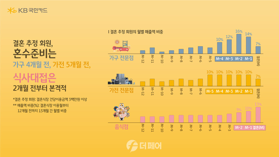 가전 업종도 결혼식 12개월 전부터 결혼식 6개월 전까지는 이용금액 비중이 5~7%로 비중이 증가하기 시작해 △5개월 전부터 1개월 전까지 10% △결혼 당월 7%로 결혼식 5개월 전부터 결혼식 당월까지의 이용금액이 전체 13개월 가전업종 이용금액의 57%를 차지했다.