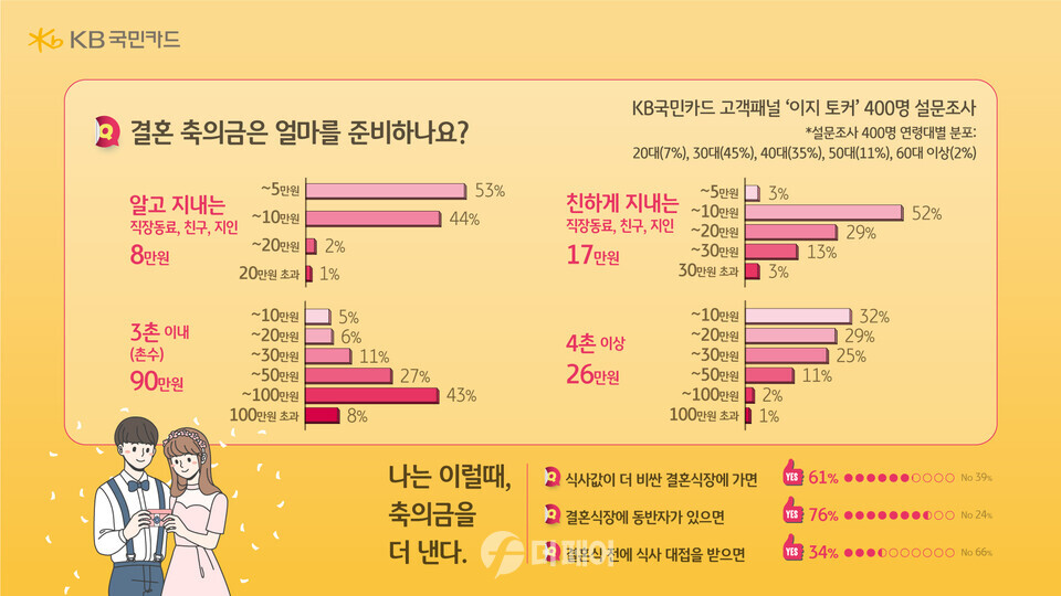 KB국민카드 고객 패널'이지 토커' 400여 명을 대상으로 설문을 진행한 결과, 결혼식장에서 축의금은 알고 지내는 사이에는 평균 8만 원을 내고 친한 사이에는 17만 원을 내는 것으로 나타났다. 촌수를 기준으로 하면 3촌 이내는 90만 원, 4촌 이상은 26만 원을 냈다. 축의금 액수를 정할 때 가장 큰 영향을 미치는 항목은 결혼식장의 식사값과 동반자 여부로 나타났다.