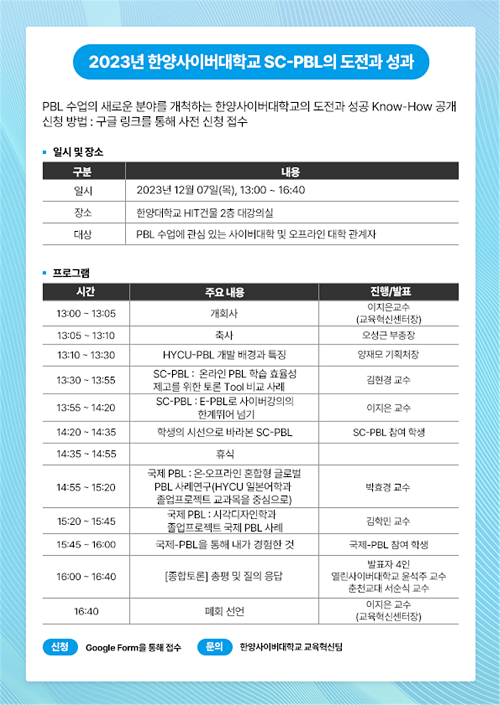 [더페어] 손호준 기자=한양사이버대학교는 원격대학 교육혁신지원사업을 통해 교내에 PBL 수업을 확산하기 위한 노력을 이어왔다. 이에 그간의 경험과 노하우를 공유하고 타 대학으로 확산하기 위하여 12월 7일(목) 13시부터 한양대학교 HIT에서 성과확산 WS을 진행한다.