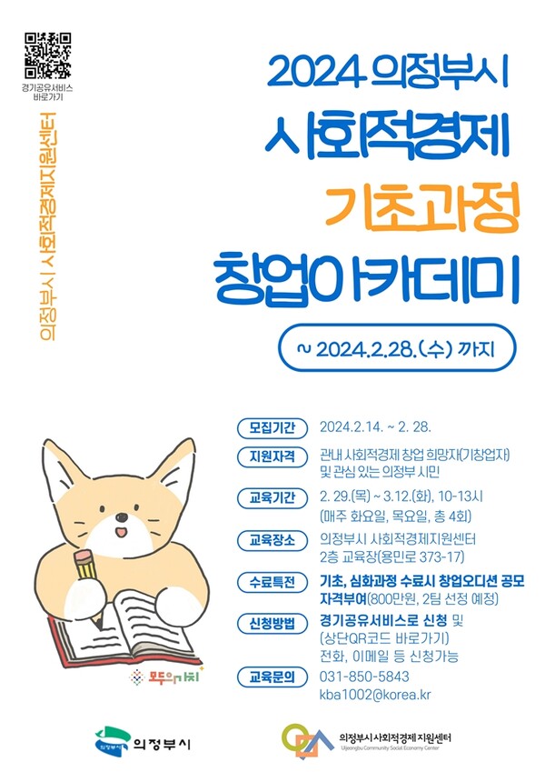 [더페어] 노만영 기자=의정부시가 오는 28일까지 '2024년 의정부시 사회적경제 창업아카데미 기초과정' 수강생을 모집한다.
