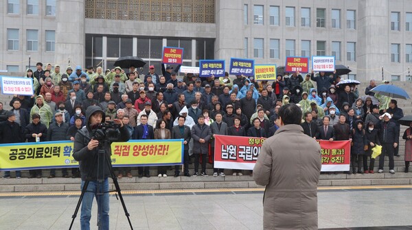 [더페어] 노만영 기자=더불어민주당 김성주 국회의원(전북 전주병, 정무위윈회)이 19일 국회의사당 앞에서 남원시의회와 '국립공공보건의료대학 설립·운영에 관한 법률안'(이하 국립의전원법)의 국회 통과를 촉구하는 결의대회를 진행했다.