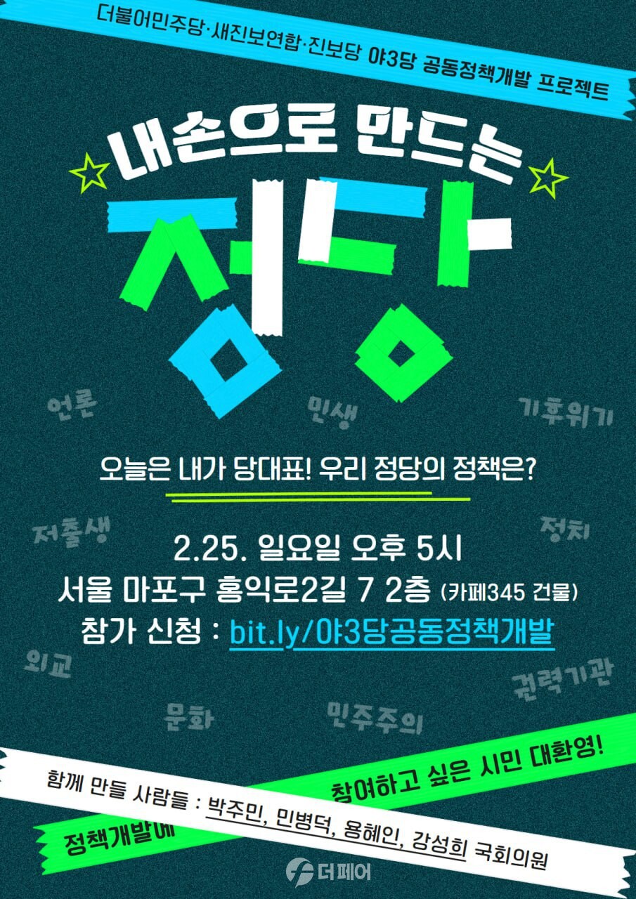[더페어] 이용훈 기자=더불어민주당, 새진보연합, 진보당이 공동으로 오는 25일 '내 손으로 만드는 정당 – 야3당 공동정책개발 프로젝트'를 개최한다고 24일 밝혔다.