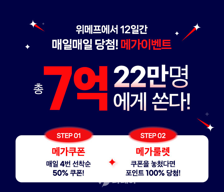 위메프는 본 행사에 앞서 27일부터 사흘간 티저 페이지를 열고 총 22만 명을 대상으로 전하는 파격 혜택을 공개한다. 먼저 ‘위메프 메가세일’ 기간 매일 총 3천 명에게 최대 50%(1만 원 이상 구매 시 최대 5천 원) ‘메가쿠폰’을 제공해 고객의 초특가 쇼핑을 지원한다. 또 100% 당첨 ‘메가룰렛’ 이벤트를 진행하고 참여 고객 전원에게 위메프 포인트를 선물한다.