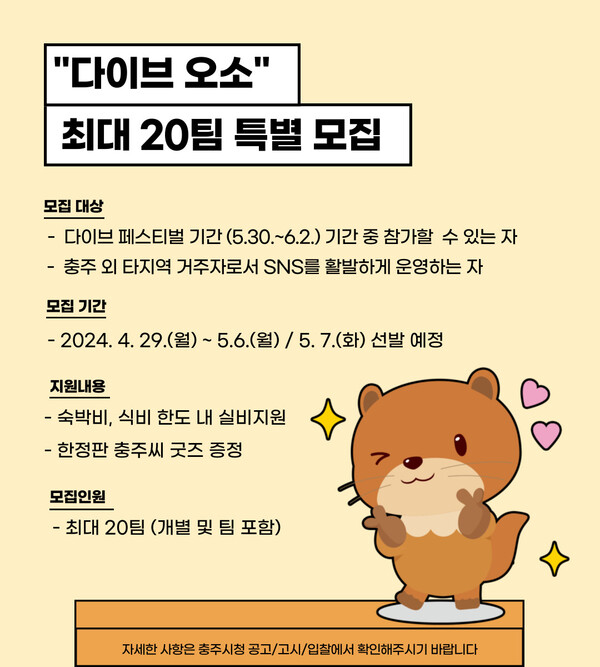 시는 최대 20팀(개별 포함)을 선발해 축제 기간 중 사용한 숙박비와 식비(체험비 제외)를 최소 1박 2일에서 최대 3박 4일 범위 내에서 지원하며, 한정판 충주씨 굿즈 또한 증정할 예정이다.