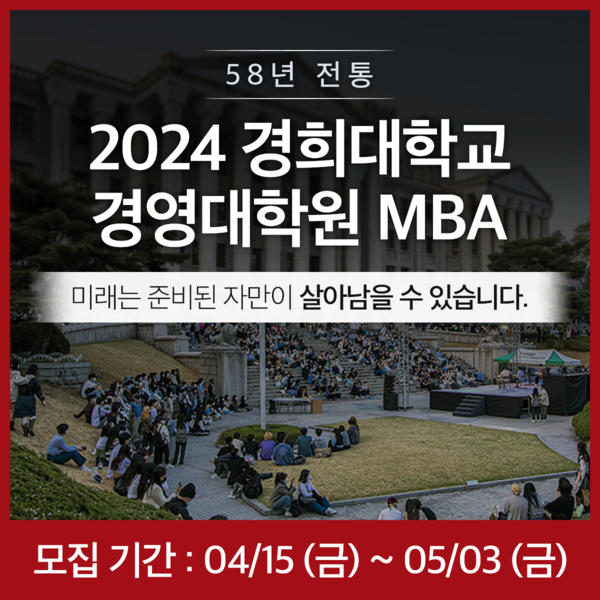 한편 이번 경희대 경영대학원의 2024 후기 신입생 모집은 △경영학과 △세무관리·회계학과 △미디어&커머스 경영학과 △융합경영학과 △의료경영학과 △문화예술경영학과 △E-MBA학과 △부동산학과 등 8개의 학과에서 진행 중이며 원서모집은 5월 3일까지 진행된다.