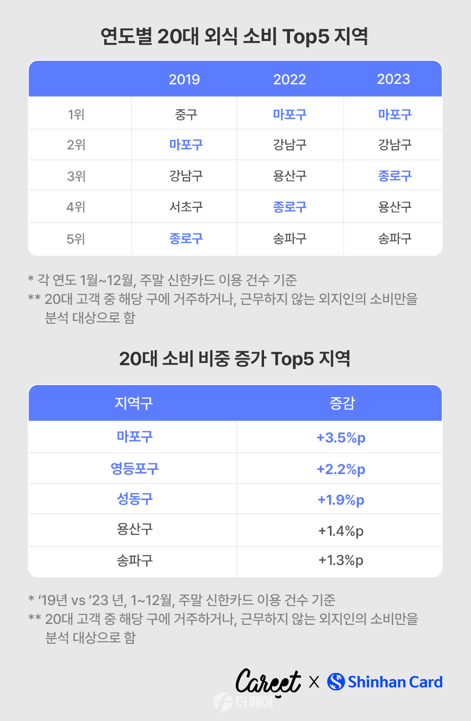 20대가 주말에 외식을 위해 자주 찾는 지역이 어디인지도 지난 5년간(2019년~2023년)의 데이터를 통해 분석했다. 2019년만 해도 명동, 충무로, 남산 등이 위치한 중구가 1위로 가장 많은 이용 건수를 보였으나, 2023년에는 홍대, 합정, 상수 상권을 중심으로 20대의 소비가 이루어지면서 마포구가 1위로 올라섰다. 마포구는 홍대 상권이 연남, 망원 지역으로 확장되고, 아이돌 생일 카페 문화가 해당 상권으로 집중되면서 더욱 각광을 받고 있다. 이어 강남구와 종로구가 뒤를 이었다. 한편 영등포구와 성동구는 2019년 대비 2023년 20대의 소비 비중 증가폭이 가장 큰 마포구(+3.5%p) 다음으로 높은 경향을 보였는데, 영등포구(+2.2%p)의 경우는 더현대 서울이 입점한 영향이 큰 것으로 파악되고, 성동구(+1.9%p)는 맛집과 팝업스토어의 성지로 떠오르면서 주목을 받은 것으로 풀이된다.
