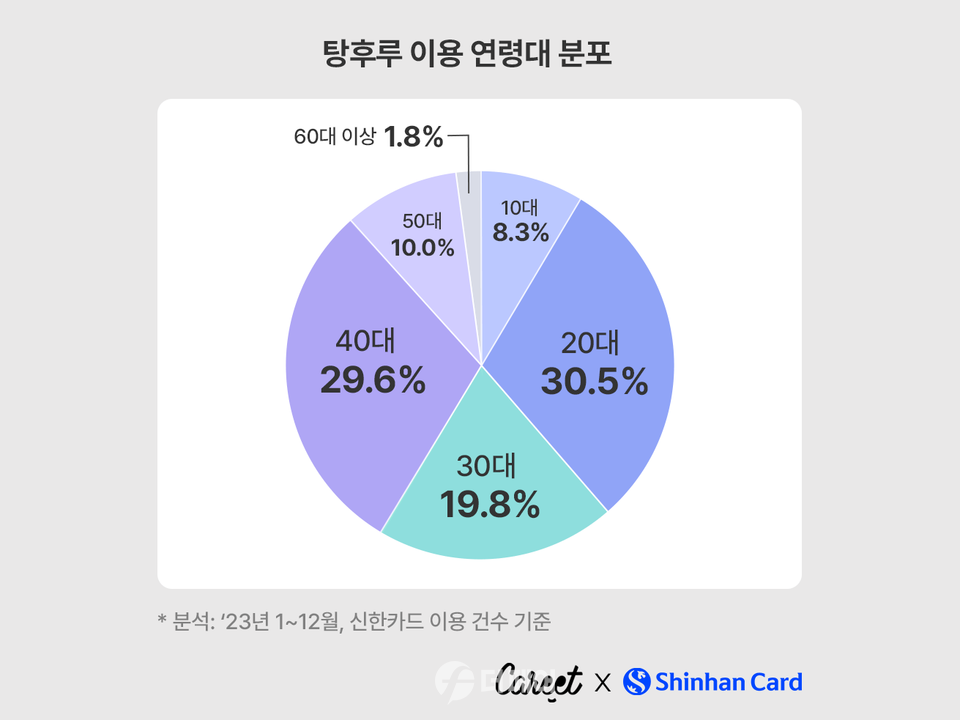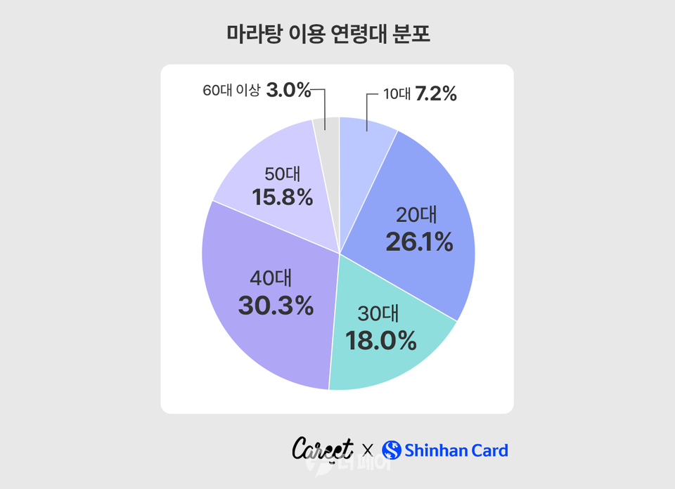 자극적이고 중독적인 맛으로 유명한 마라탕과 탕후루의 인기는 아직도 유효한 것으로 나타났다. 2023년 12월부터 2024년 2월까지 이용 건수를 기준으로 마라탕 이용 연령대를 분석해 보니, 10대(7.2%)와 20대(26.1%)를 합친 비율이 33.3%로 나타났다. 주목할 점은 40대의 이용 비중이 30.3%로 전 연령대에서 가장 높게 나타났는데, 10대 청소년 자녀를 둔 부모의 평균 나이대가 40대라는 점을 고려했을 때, 자녀를 위해 소비한 데이터가 영향을 미쳤을 것으로 예상된다.