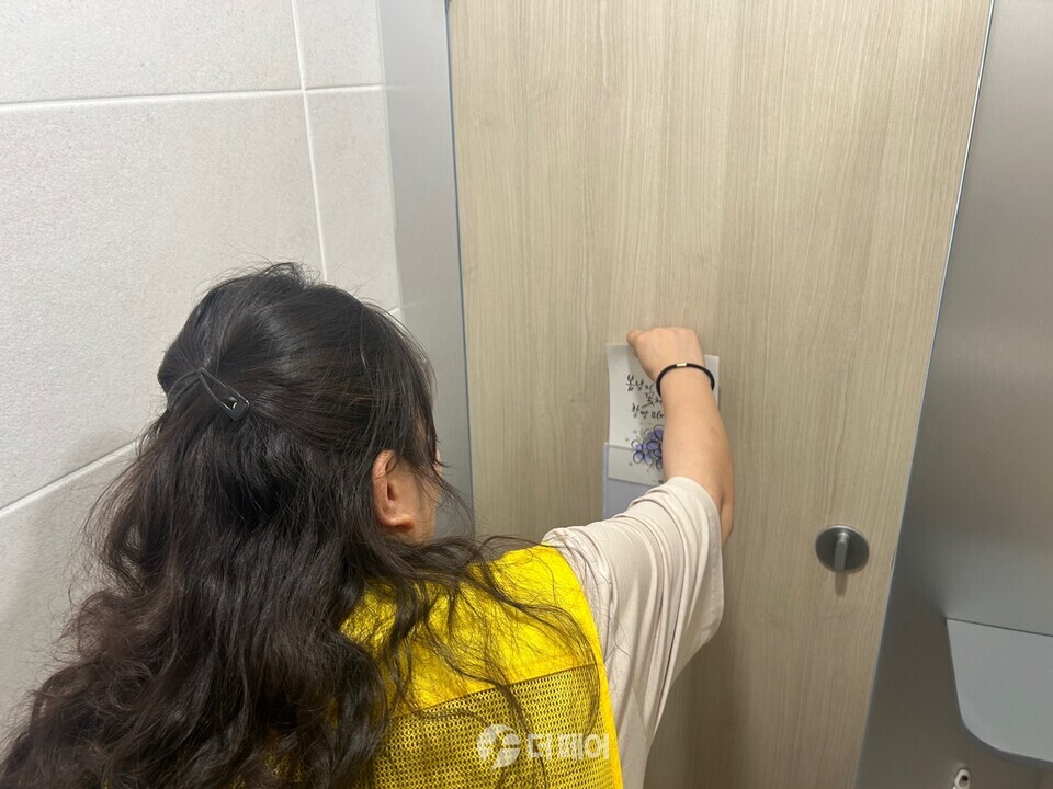 [더페어] 안해연 기자=충주시자원봉사센터(센터장 김낙정)에서 올해 상반기 자원봉사 전문교육으로 양성된 캘리원정대봉사단(회장 송정례)이 5일 충주시청 화장실에 캘리그라피 엽서를 직접 쓰고 아크릴판에 넣어 부착하는 봉사활동을 펼쳤다.