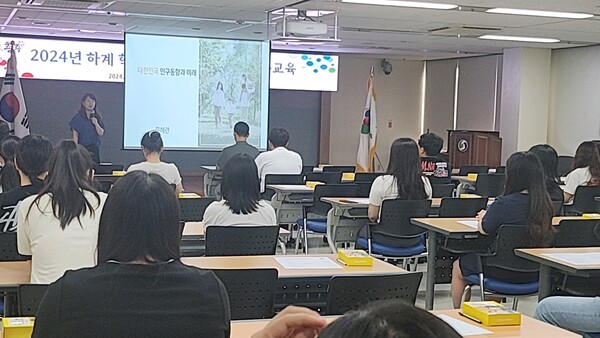 2024년 하계 근로활동 참여 대학생 인구교육은 총 2회에 걸쳐 약 100명의 학생을 대상으로 진행되며, 다음 교육은 8월 2일에 실시될 예정이다.