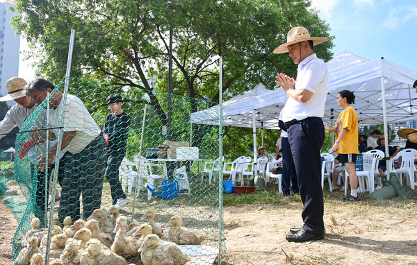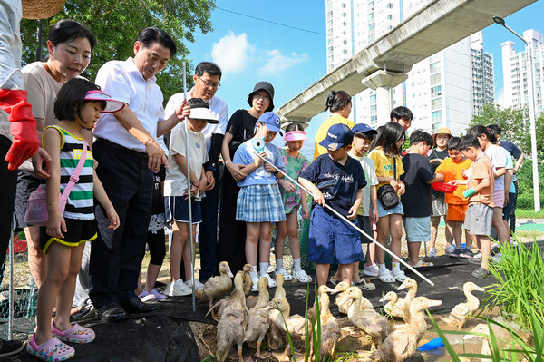 [더페어] 홍미경 기자= 의정부시(시장 김동근)는 지난 2일 장암동 광명교회 하부 중랑천에 조성된 벼농사 체험장에서 친환경 농법의 일환으로 오리를 방사했다고 5일 밝혔다.