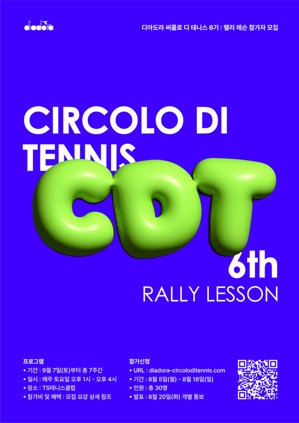 ‘CDT 6기; 랠리 레슨’ 모집 인원은 총 30명으로, 참가 신청 마감일은 오는 8월 18일이다. 레슨은 9월 7일부터 매주 토요일마다 7주간, 오후 1시~4시까지 3시간씩 진행된다. 장소는 경기도 하남에 위치한 TS테니스 스포츠클럽이다.