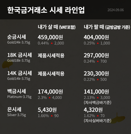 18K 금시세는 팔 때 29만7000원, 14K 금값시세는 팔 때 23만300원이다. 살때 시세는 제품가격이 적용되고 있다.