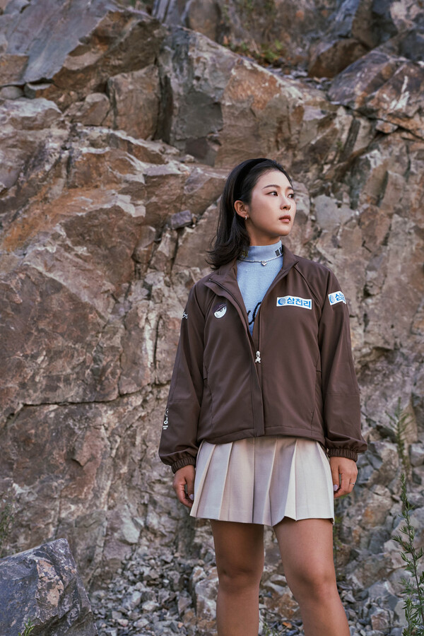 전예성은 화보에서 ‘래글런 스윙 자켓’과 ‘모크넥 방풍 스웨터’를 착용해 가을에 어울리는 차분하고 고급스러운 퍼포먼스 룩을 완성했다.