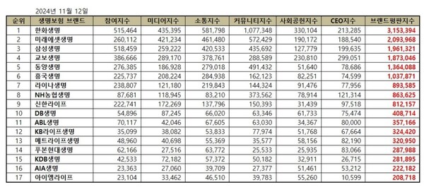 생명보험 브랜드평판 2024년 11월 순위는 한화생명, 미래에셋생명, 삼성생명, 교보생명, 동양생명, 흥국생명, 라이나생명, NH농협생명, 신한라이프, DB생명, ABL생명, KB라이프생명, 메트라이프생명, 푸본현대생명, KDB생명, AIA생명, 아이엠라이프 순이었다.