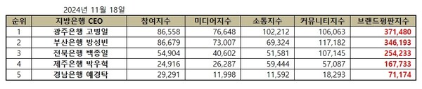 2024년 11월 지방은행 CEO 브랜드평판 순위는 광주은행 고병일, 부산은행 방성빈, 전북은행 백종일, 제주은행 박우혁, 경남은행 예경탁 순이었다.