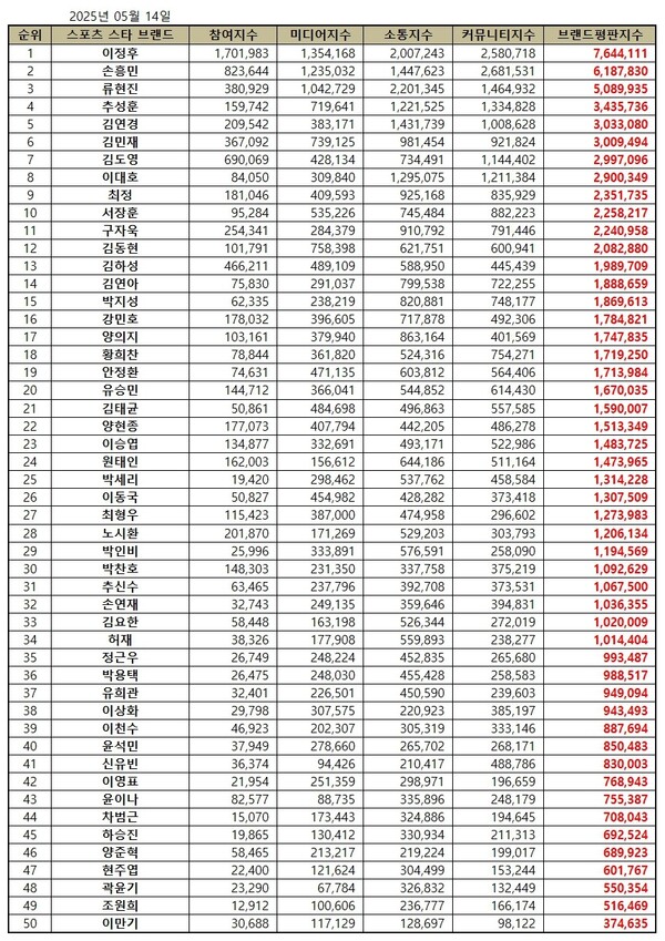 한국기업평판연구소는 2025년 4월 14일부터 2025년 5월 14일까지 측정한 스포츠 스타 브랜드 빅데이터 87,304,506개를 소비자 행동분석을 통해 스타 브랜드에 대한 참여지수, 미디어지수, 소통지수, 커뮤니티지수를 측정한 결과 지난 4월 스포츠 스타 브랜드 빅데이터 82,095,712개와 비교하면 6.34% 증가했다고 밝혔다.