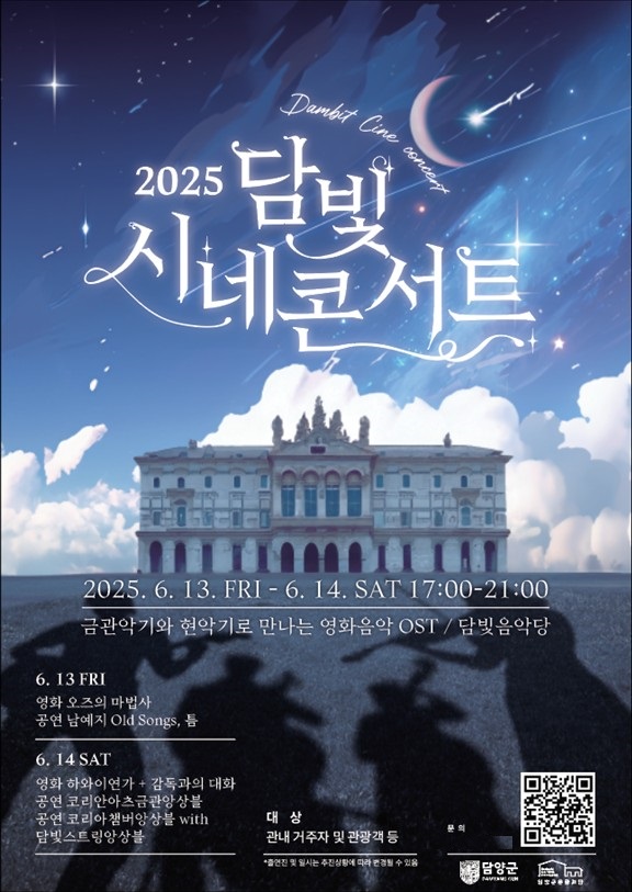 같은 날 열리는 음악 공연도 놓칠 수 없다. ‘코리안아츠 금관앙상블’은 디즈니와 지브리의 명작 애니메이션 OST를 11인조 금관악기 편성으로 선보이며, ‘코리아챔버앙상블’은 지역 청소년으로 구성된 ‘담빛스트링앙상블’과 협연해 풍부한 현악 중심의 영화음악 무대를 선사한다.