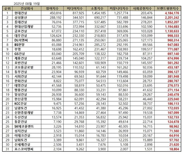 한국기업평판연구소는 2025년 7월 19일부터 2025년 8월 19일까지 건설회사 브랜드 31개의 빅데이터 19,814,681개를 분석하여 소비자들의 브랜드 참여와 소통량과 커뮤니티 지표, 브랜드에 대한 긍부정 비율을 측정한 결과 지난 7월 건설회사 브랜드 빅데이터 20,577,699개와 비교해보면 3.71% 줄어들었다고 밝혔다.