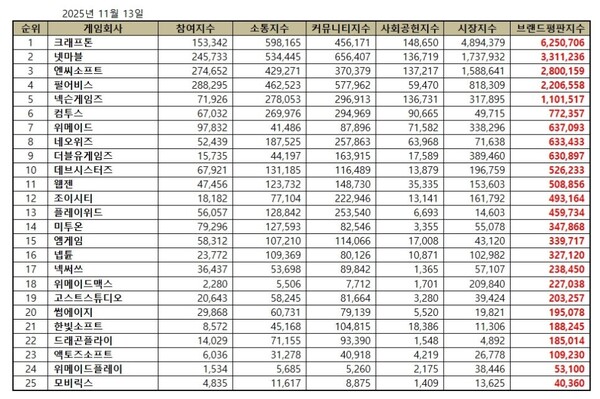 2025년 11월 게임 상장기업 브랜드평판 순위는 크래프톤, 넷마블, 엔씨소프트, 펄어비스, 넥슨게임즈, 컴투스, 위메이드, 네오위즈, 더블유게임즈, 데브시스터즈, 웹젠, 조이시티, 플레이위드, 미투온, 엠게임, 넵튠, 넥써쓰, 위메이드맥스, 고스트스튜디오, 썸에이지, 한빛소프트, 드래곤플라이, 액토즈소프트, 위메이드플레이, 모비릭스 순으로 분석됐다.